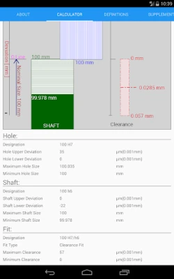 The calculator works in line with ISO 286-1 (2010), ISO 286-2 (2010) and ANSI B4.2 (1978) standards which are based on metric units. According to the input parameters of nominal size and hole/ shaft tolerances, size limits and deviations for hole/shaft are calculated and fit type is selected among the clearance, transition and interference fits.