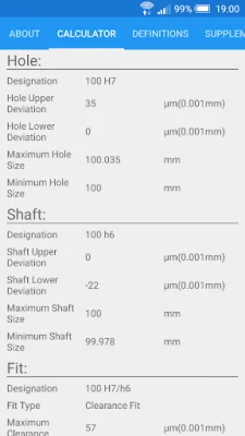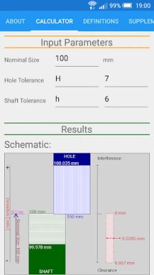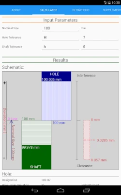 The calculator works in line with ISO 286-1 (2010), ISO 286-2 (2010) and ANSI B4.2 (1978) standards which are based on metric units. According to the input parameters of nominal size and hole/ shaft tolerances, size limits and deviations for hole/shaft are calculated and fit type is selected among the clearance, transition and interference fits.