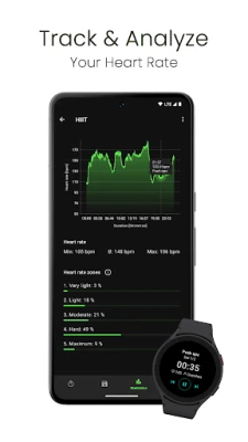 - Record your heart rate throughout your workout and analyze your heart rate zones, training intensity and calories burned in the phone app