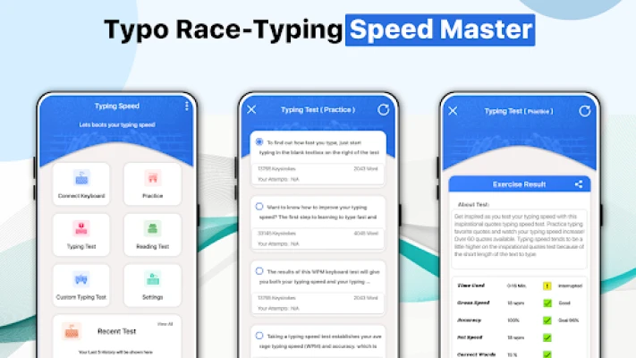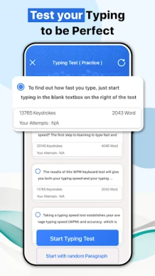 Enhance your typing skills and become a typing master with typing test app. Test master gives you ultimate range of paragraphs for typing test. Online typing tester is definitely going to be very helpful for users who are searching for typing test apps.Measure your accuracy while typing.